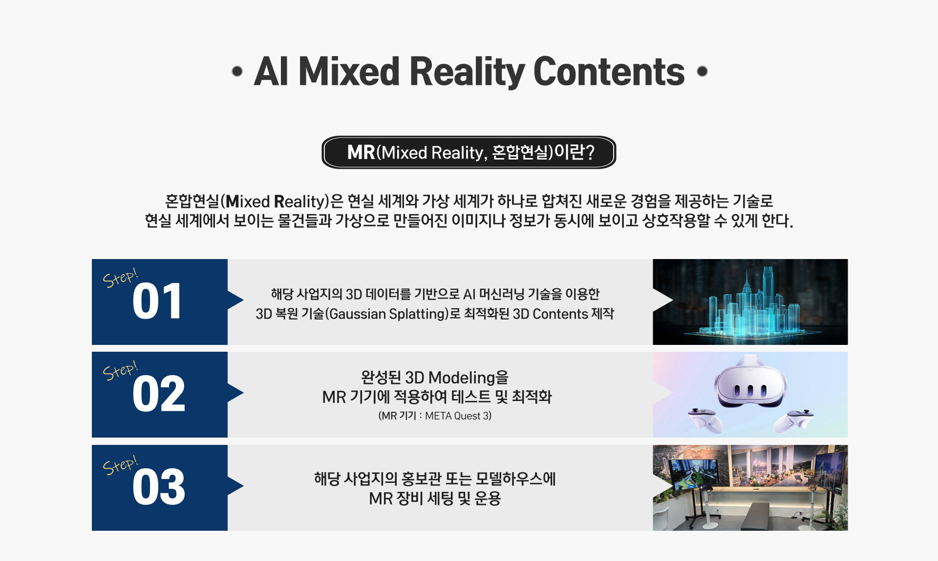 독립군기획은 세계 최초로 AI 및 MR 기술을 통한 3D 모형을 홍보관 및 모델하우스에 도입하여 운영하고 있습니다.